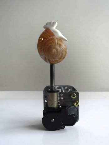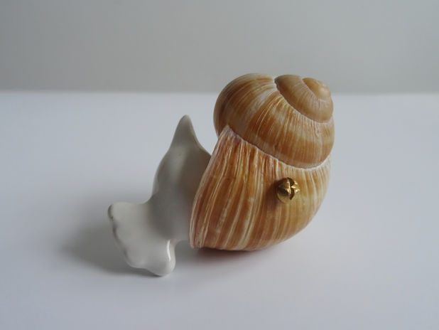 Patiently practicing pacing - artefact: music box, porcelain, sterling silver (925), 14 karat gold, snail shell (2023 - 2025). To the project →