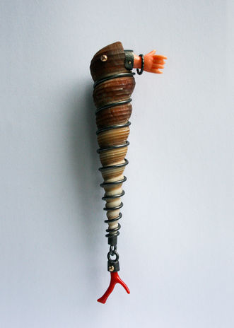 Turritella - brooch: sterling silver (925), 14 karat gold, seashell, vintage, plastic doll hand, antique precious coral (2025 - 2026).